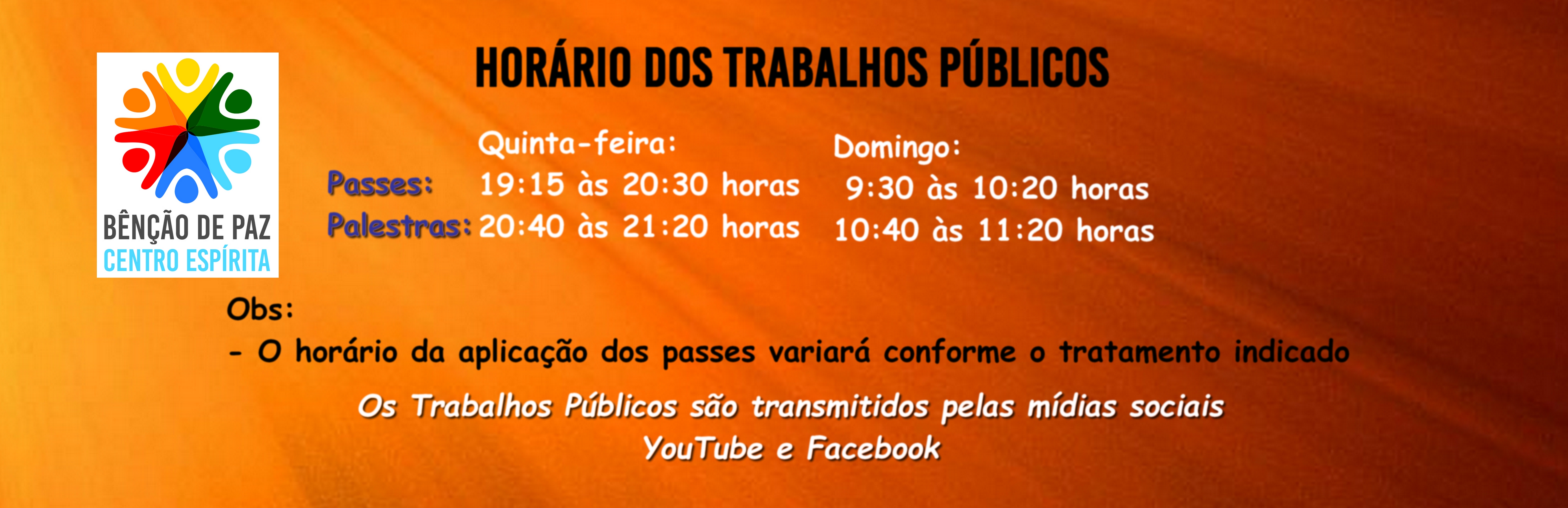 Nossos Trabalhos Públicos ocorrem todas as quintas-feiras das 19:00 às 21:20 horas e aos domingos das 9:45 às 11:20 horas, sempre com o Evangelho do Cristo a nos alegrar o coração.