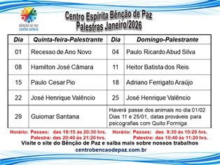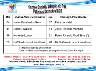 Confira as atividades, palestras e eventos realizados pelo Centro Espírita Bênção de Paz.