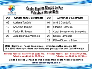 Confira as atividades, palestras e eventos realizados pelo Centro Espírita Bênção de Paz.